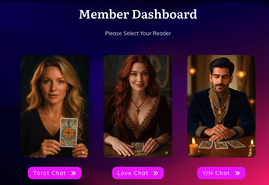 In just a moment, you'll arrive at your Dashboard, where you'll be met by 3 different intelligent Tarot Readers, each with their own special gifts and talents - all ready to answer every question you have.